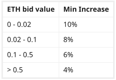 Lors de la mise d'une enchère, toute surenchère doit être au minimum un incrément supérieur à l'enchère actuelle. Tu peux regarder le tableau ci-dessous pour voir les incrémentations minimales.